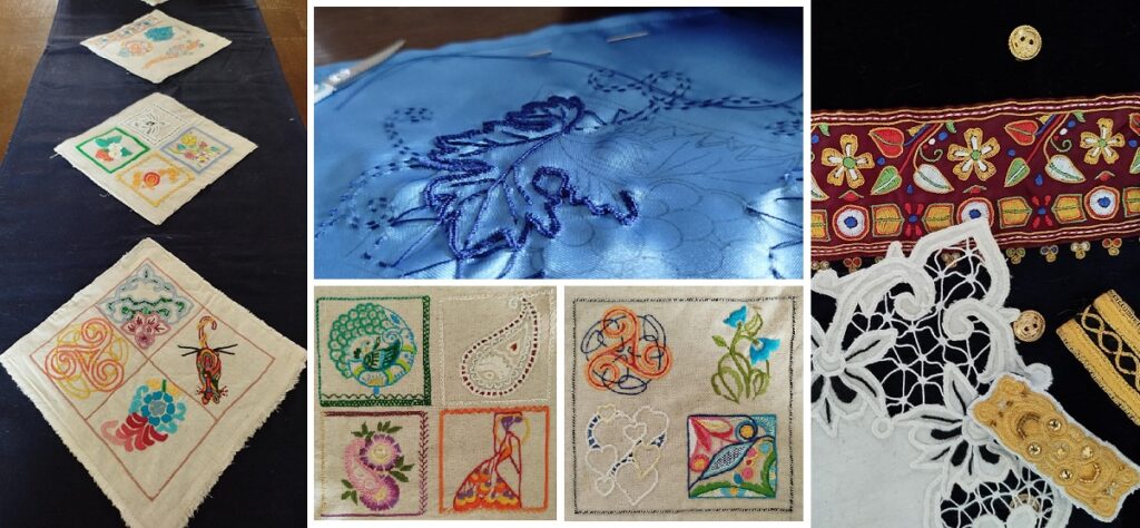 Quelques exemples ci-dessus, avec des projets communs (chemin de table et tablier) et un pêle-mêle de réalisations personnelles inspirées de la broderie traditionnelle bretonne.
